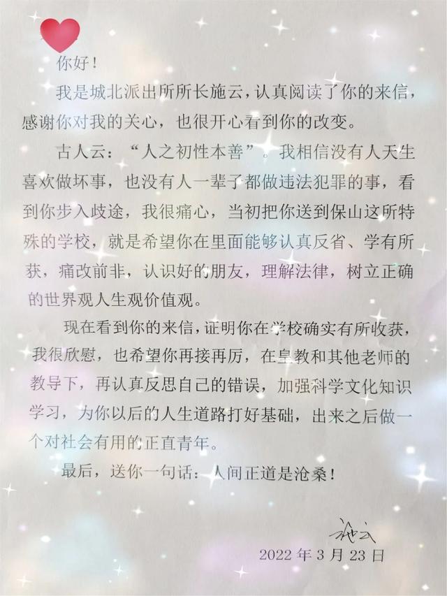 收到信件后,为鼓励小新改正错误,重新树立正确的世界观、价值观、人生观,施所长还给他 寄来了回信 ,对他寄予希望,鼓励他痛改前非,努力学习。