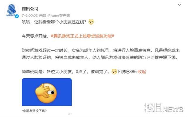 7月5日,腾讯游戏官方发布消息称,为针对性解决未成年人冒用成年人身份在夜间偷玩游戏的问题,腾讯游戏7月5日正式上线“零点巡航”功能。