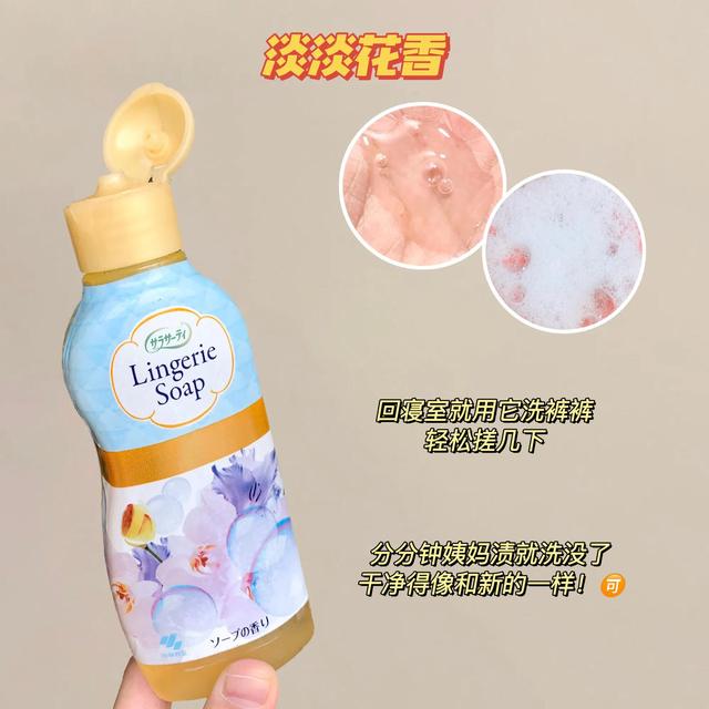 它是女生专门清洗姨妈渍的,倒一点浸泡20分钟左右,用大力搓洗就不留一点污渍弱酸性的配方,也不会伤手。