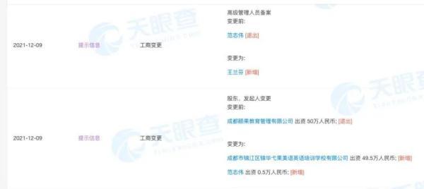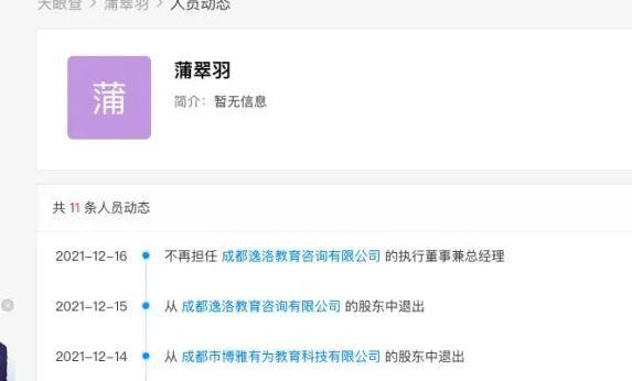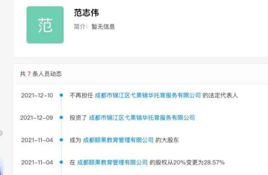 绿地468校的董事长蒲翠羽,在该校区关停的前一天和当天,相继退出成都逸洛教育咨询有限公司、成都市博雅有为教育科技有限公司的股东。此外,该校区的最大股东,成都颐果教育管理有限公司的法定代表人范志伟,在12月9日投资了成都市锦江区弋果锦华托育服务有限公司,即弋果美语锦华万达校区的托育幼儿园。12月10日不再担任该托育机构的法定代表人。