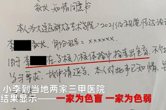随后,小李去了当地两家三甲医院,让人意外的是两次测试结果却显示不同,一家的结果是色盲,另一家是色弱。倘若小李仅仅是色弱,则并不应该被强制退学,这让小李感到十分无奈。