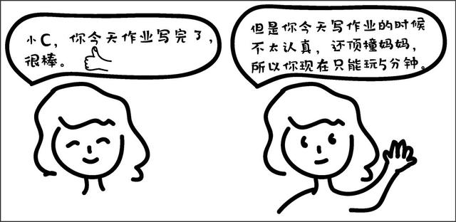 这时,妈妈就可以说:“小C,你今天作业写完了,很棒。但是不太认真,还顶撞妈妈,所以只能玩5分钟。”