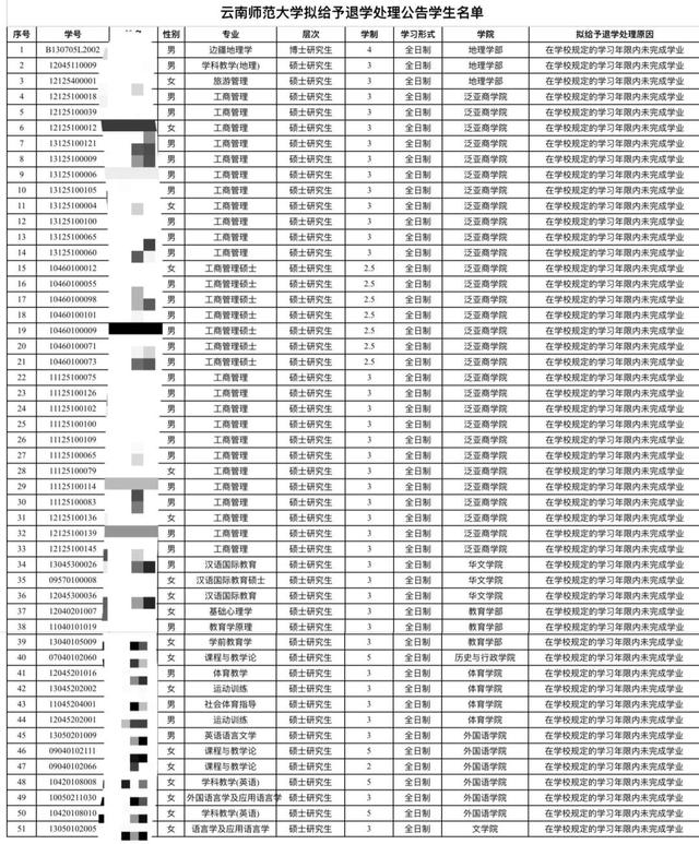 日前,云南师范研究生院官网发布一则拟给予51人退学处理的公告,公告称,51名学生因在规定学习年限内未完成学业,根据根据《普通高等学校学生管理规定》(教育部第41号令)第三十条以及《云南师范研究生管理规定》(云师大研〔2017〕24号)第三十九条之规定,经研究,学校给予该51名学生给予退学处理,并印发《云南师范退学处理告知书》。