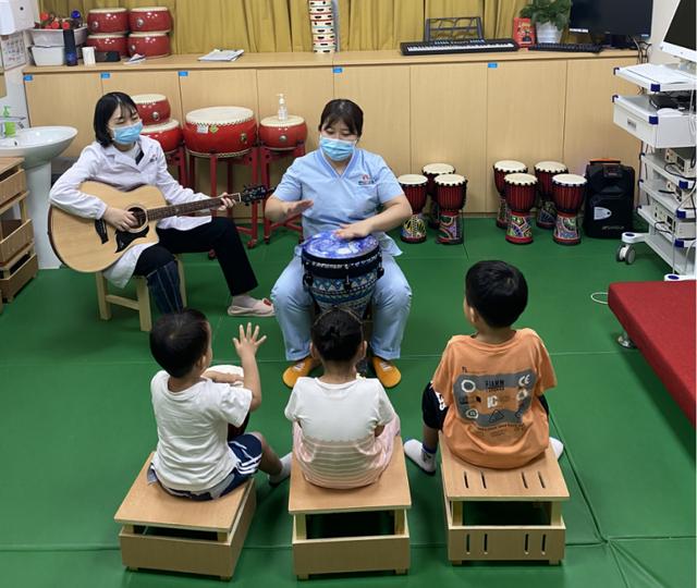 在音乐治疗集体课中,小安也从两耳不闻、两眼不看,不愿意参与到集体课堂中,对各种乐器不敢兴趣,不愿意与同伴接触,不遵守课堂秩序和规则。慢慢地安坐能力提升,愿意参与到集体活动中,听从简单指令,能配合老师演奏乐器。