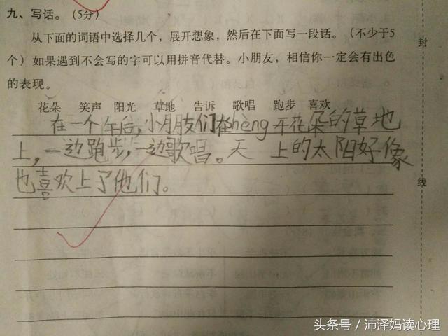 另外,一年级孩子就要会看图写话,能够根据几个词语,写一篇小短文了,如果没有阅读作为基础,孩子的词汇量会很少,组织语言的能力也会较差,学起语文就比较困难。下图是我家孩子语文期末考试的题目。