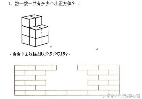 还有图形问题,数一数有多少个正方体,缺少多少块砖头等,这些题目对孩子的空间思维能力要求很高,所以,一定要养成孩子勤于思考的习惯。