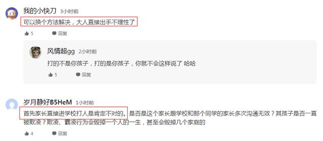 对于这种行为,我相信多数网友都会觉得不妥,一位网友就说:可以换个方法解决,大人直接出手不理性了。另外一位网友也直言,家长直接进学校打人,是肯定不对的。
