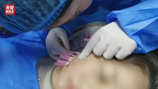 第五天是面部线雕课程,这也是医美项目中比较高端的手术项目,更挣钱。上课时老师先播放了一段录像,接着讲解如何用针。下午实操课上,老师在简陋的教室里现场给学员做起了面部线雕手术。