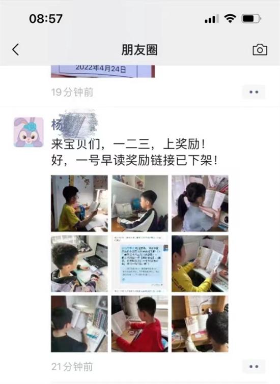丁兰第三小学的老师们各显神通,奖励和督促相结合,比如通过直播、发放奖励卡、朋友圈公开表扬、“大家来找茬”、在线云听写、云端齐早读等趣味性活动,极大地激发了学生学习积极性。