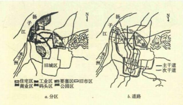 基于这样的期望,孙中山将南京的长江沿岸作为工业区开发,并提出了切实而具体的规划:应该“削去下关全市”,将南京的码头全部“移至米子洲与南京外郭之间,而米子洲后面水道自应闭塞,如是则可以作成一泊船坞,以容航洋巨舶” 。至于主城对岸的浦口,则为“长江以北一切铁路之大终点”,“在山西、河南煤铁最富之地,以此地为与长江下游地区交通之最近商埠,即其与海交通亦然”。考虑到近几十年建港筑路缩窄了江面,两岸安全存在隐患,孙中山再提出应该用坚固的材料修堤岸,“每边各数英里”,而“河堤之内,应划分为新式街道,以备种种目的建筑所需”。