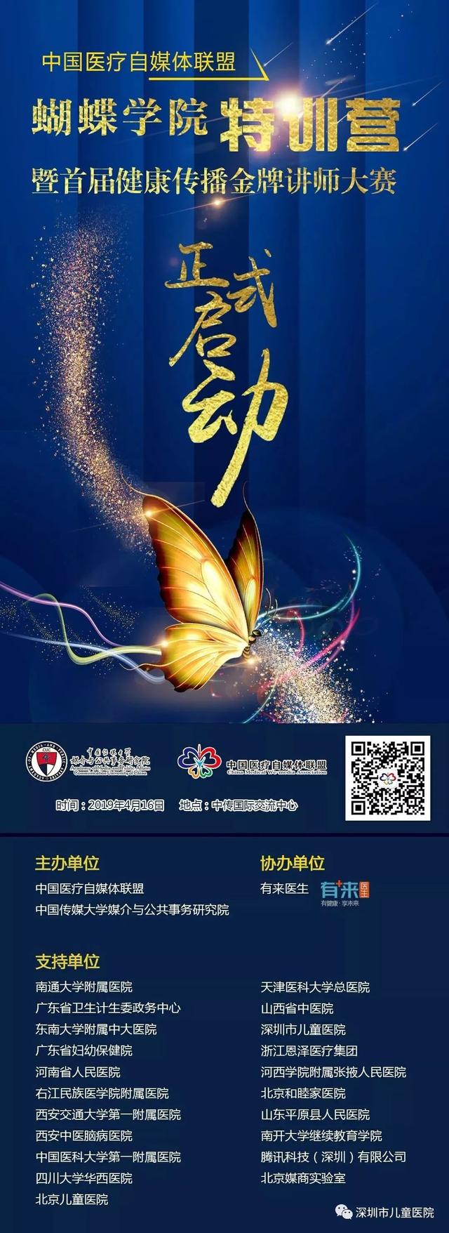 为在全国遴选和孵化健康传播新媒体人才,蝴蝶学院于2019年4月16日正式启动中国医疗自媒体联盟蝴蝶学院特训营暨首届健康传播金牌讲师大赛。本次活动集特训和大赛为一体,采用风采展示、封闭式特训、学习成果PK等形式,以赛代培,以培代赛,旨在打造实战型、多维度的健康新媒体人才,提升医学领域的媒介素养和传播领域的医学素养,助力“健康中国”战略。