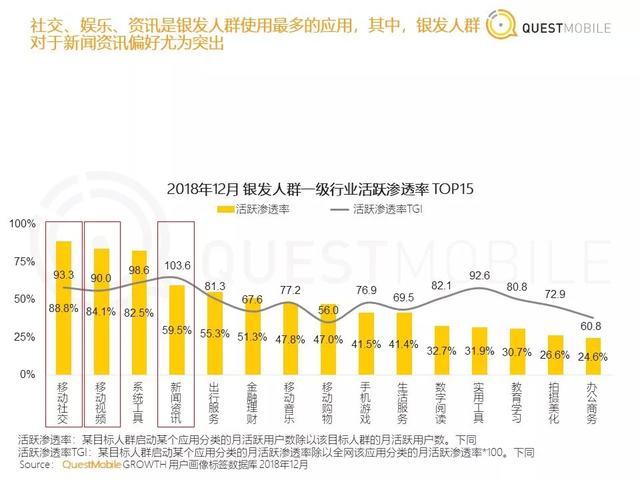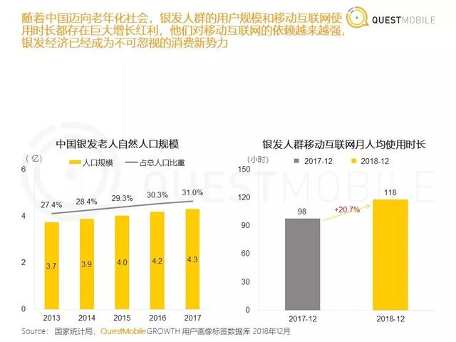 根据QuestMobile发布的《银发人群洞察报告》显示,银发人群(年龄超过50岁的人群)移动互联网月人均使用时长,从2017年12月的98小时,增长至2018年12月的118小时,同比增长20.7%,折合成日常使用时间,也就是每天有将近4个小时在使用互联网。