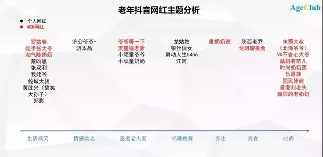 根据AgeClub的数据统计,在抖音平台上,中老年网红主要可以分为以济公爷爷游本昌、张双利为代表的个人网红,和以罗姑婆、末那大叔为代表的MCN网红,越来越多的老年KOL正在涌现。