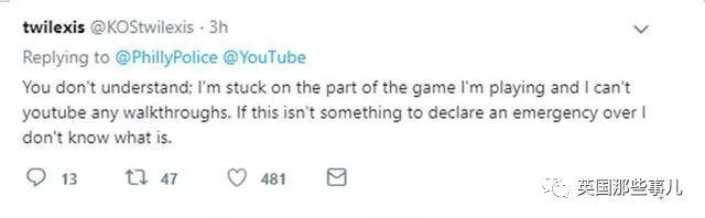 “你们不会理解的:玩游戏卡关了又不能看youtube攻略。如果这都不能叫紧急事件,我都不知道该说啥了。”