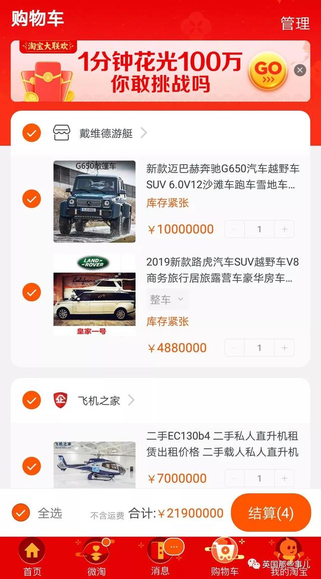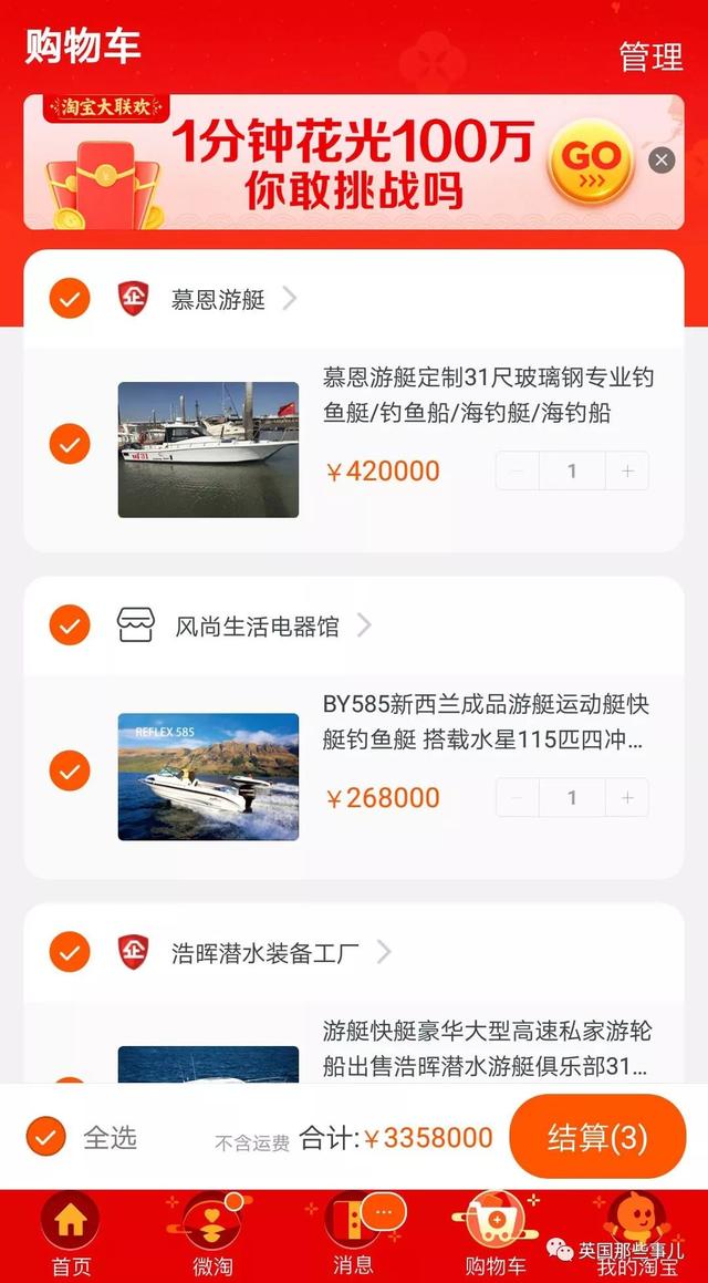 这活动是这样的,如果你参加“清空购物车”活动被抽中了超级大奖,马爸爸会请你到达杭州的淘宝总部,直接给你100万元的红包,请你现场挑战100万全部花光,限时—— 一!分!钟!