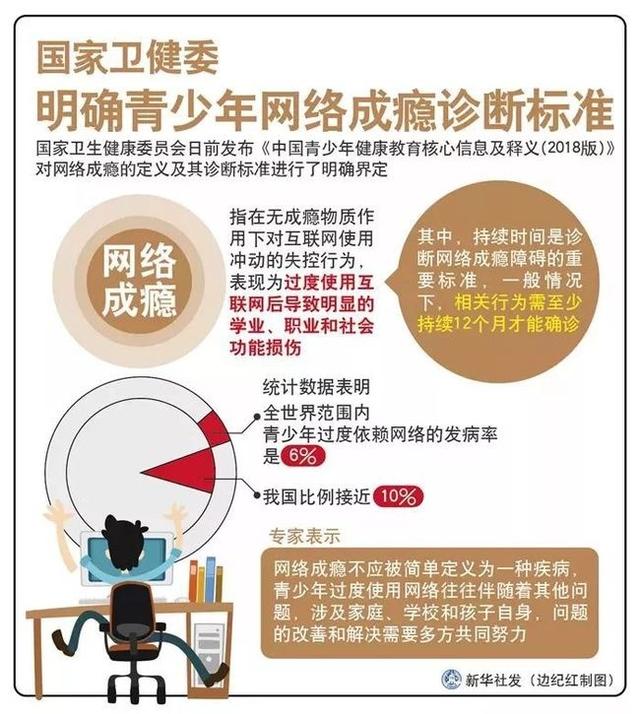 根据《中国青少年健康教育核心信息及释义(2018版)》,网络成瘾指在无成瘾物质作用下对互联网使用冲动的失控行为,表现为过度使用互联网后导致明显的学业、职业和社会功能损伤。其中,持续时间是诊断网络成瘾障碍的重要标准,一般情况下,相关行为需至少持续12个月才能确诊。