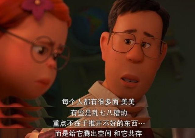 而小美的爸爸做得很好,在女儿难过时跟她谈谈心,告诉她变熊猫没有什么不好,每个人都有很多面,重点不在于推开不好的一面,而是腾出空间与它共存。