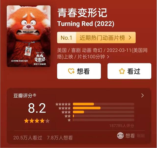 最近,皮克斯公司新上映的动画片《青春变形记》,好评如潮,豆瓣评分8.2。