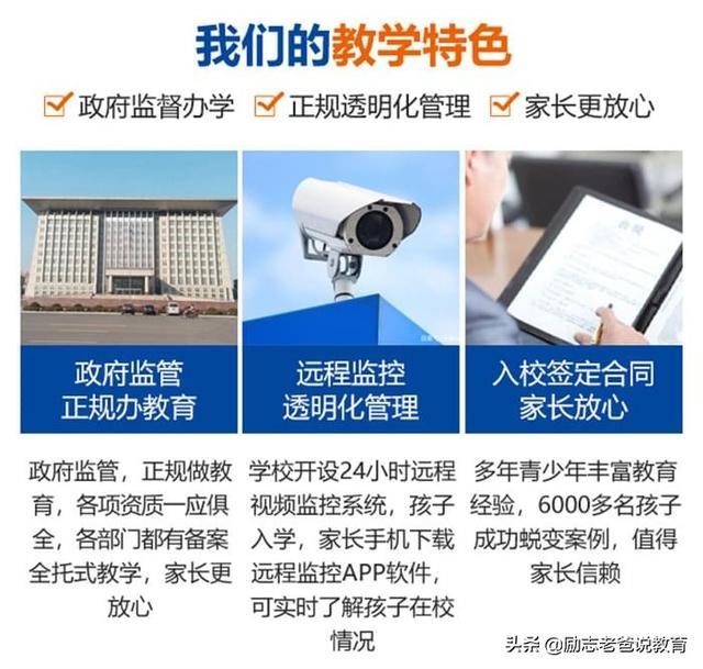 学校采用军事化全封闭式、寄宿式管理。可以随时孩子在校安全。紧张充实的学校生活,也会为学员安排合理的休息时间,每周休息一天,寒假也会放假一个月左右,而且学校在周末设有兴趣课,篮球,绘画、跳绳等使学生课余时间更丰富。